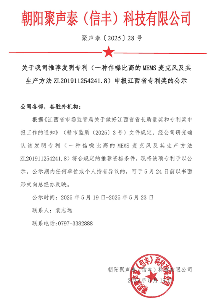 • 《一種信噪比高的MEMS麥克風(fēng)及其生產(chǎn)方法》江西省專利獎的公示